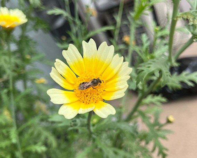6月7日、シュンギクの花に、ちびっこ蜂が来ています!!♡