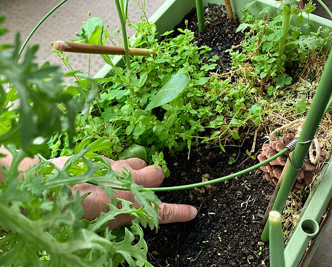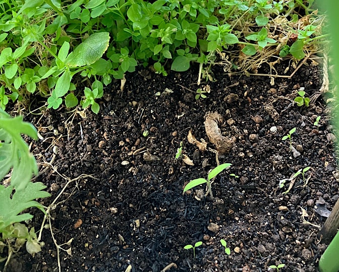 シュンギクと紅芯大根がワサワサ生えてるところに、場所を開けて、トマトとバジルを蒔きました。