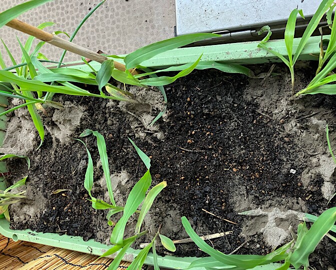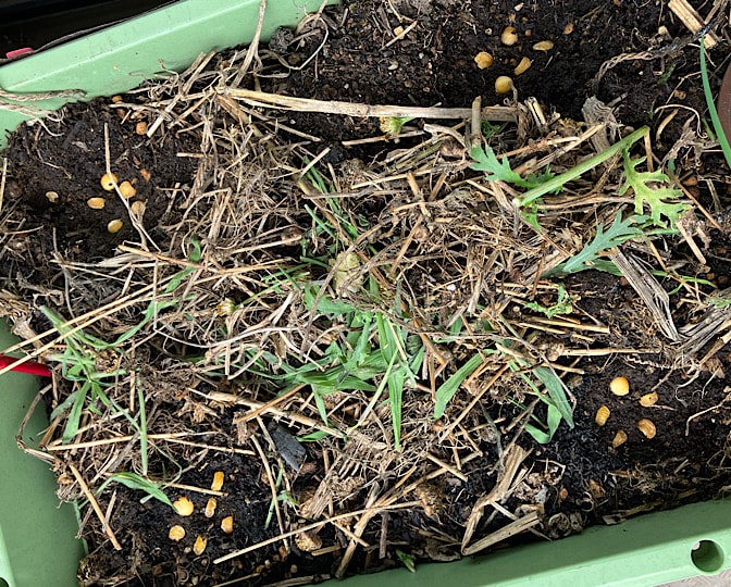 今回のプランターは、《カボチャ→葉菜(カブとかタアサイとか)のやんちゃ蒔き→とうもろこし》となっております。