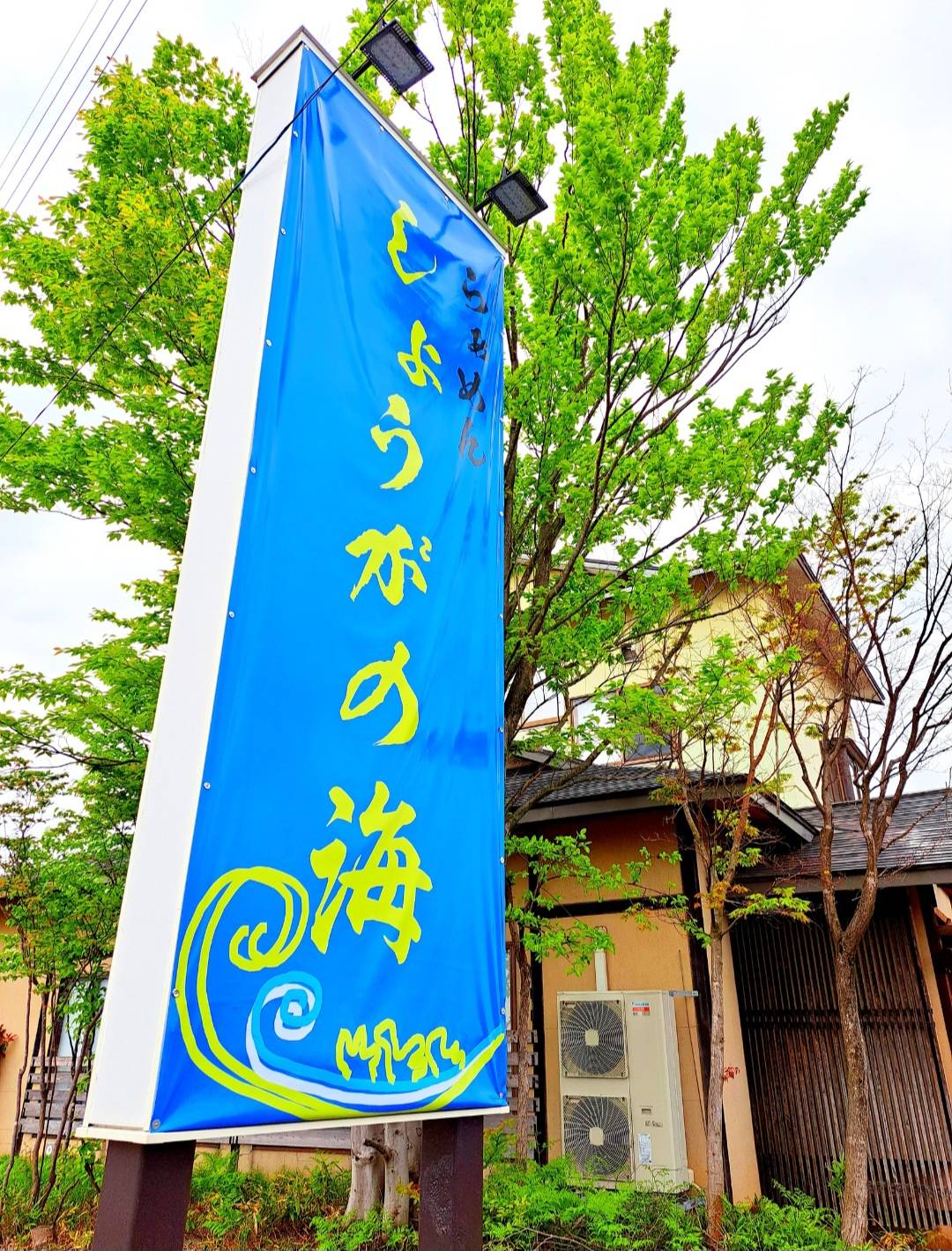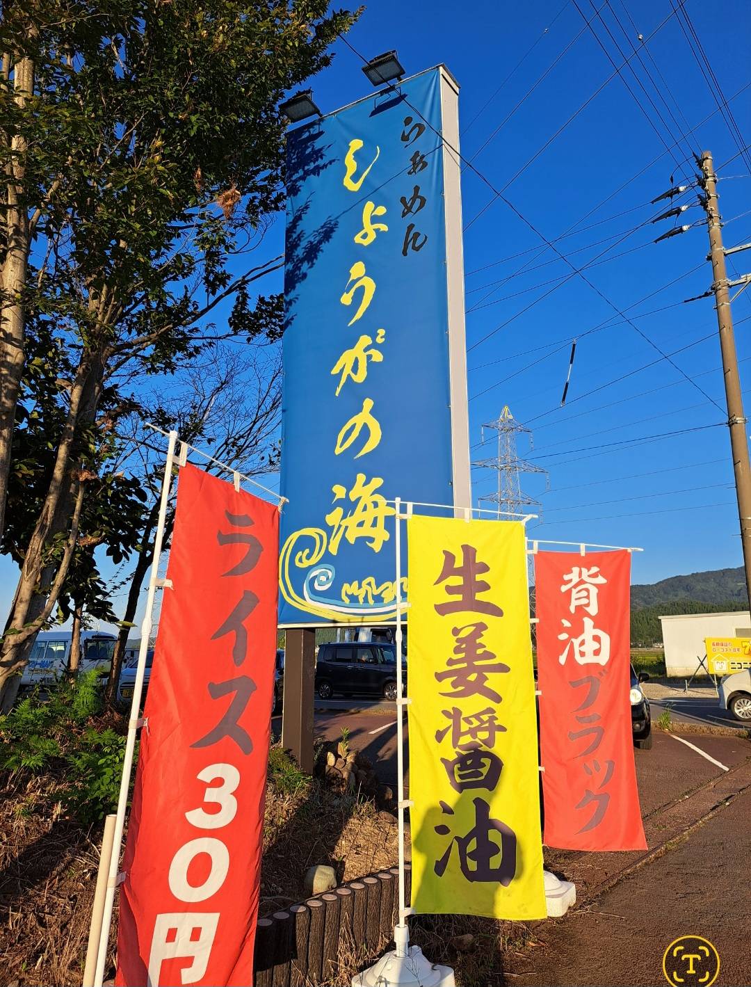 外観は、大きい青色の「らぁめん しょうがの海の のぼり」」と「生姜醤油」、「背脂ブラック」などの のぼりが有り一目でお店分かります✨
