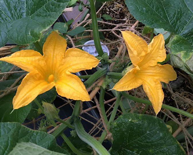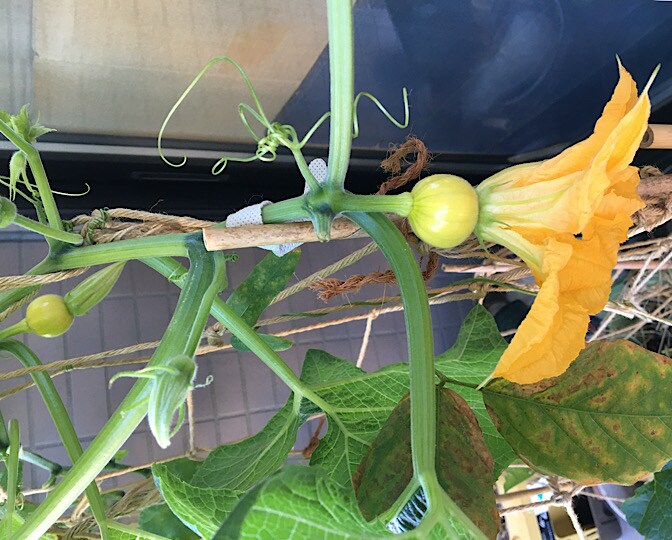 受粉させたやつの後ろに、雌花がまたできてますね!!(^。^)