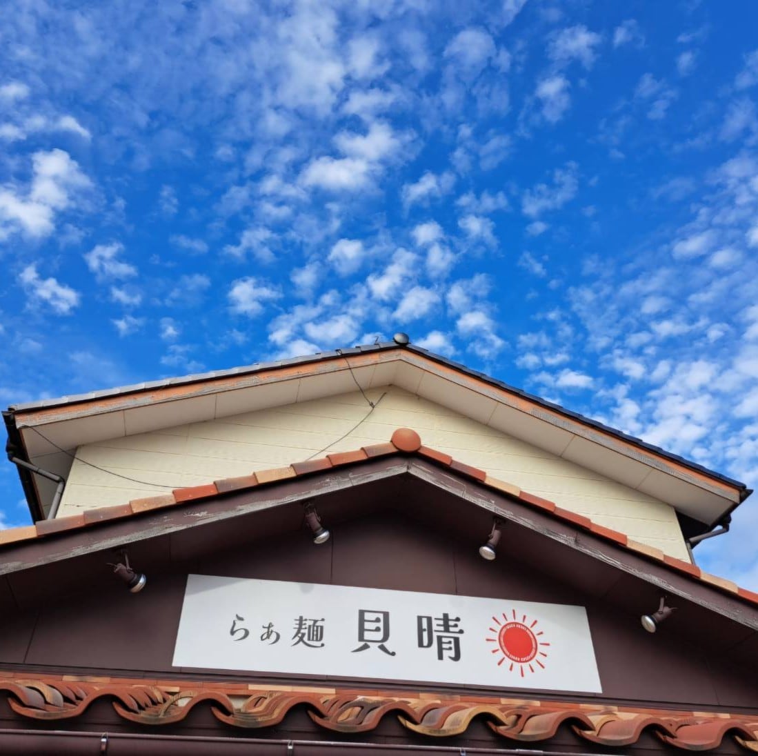 お店は 和風の木造の外観。大きい看板に「らぁ麺 貝晴」と書かれており、一目でお店が分かります✨