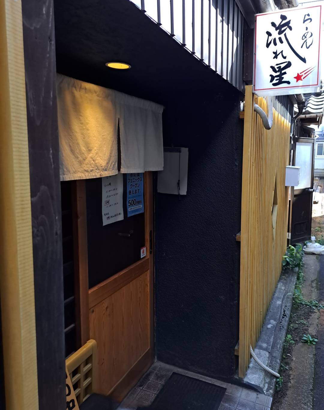 お店は 細い路地に入ったところにあり、小料理屋さんのような雰囲気外観。白い看板に「らーめん流れ星」と書かれており、一目でお店が分かります✨