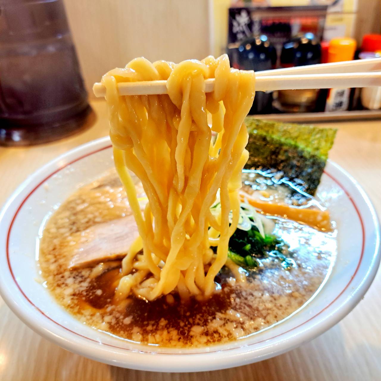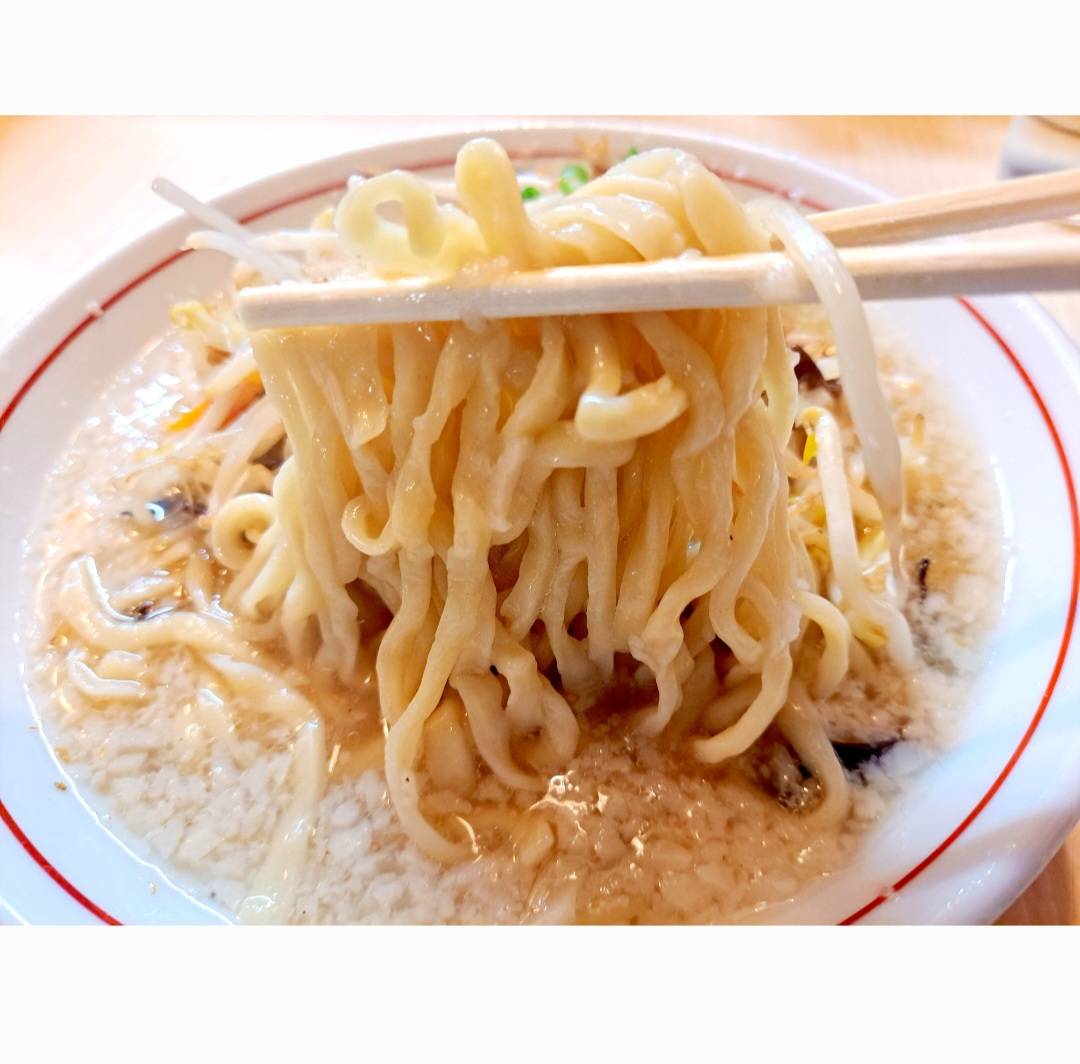 ツルッとモチモチの太麺が煮干し出汁の効いた背脂能生まみを感じるスープによく合い美味しいです✨