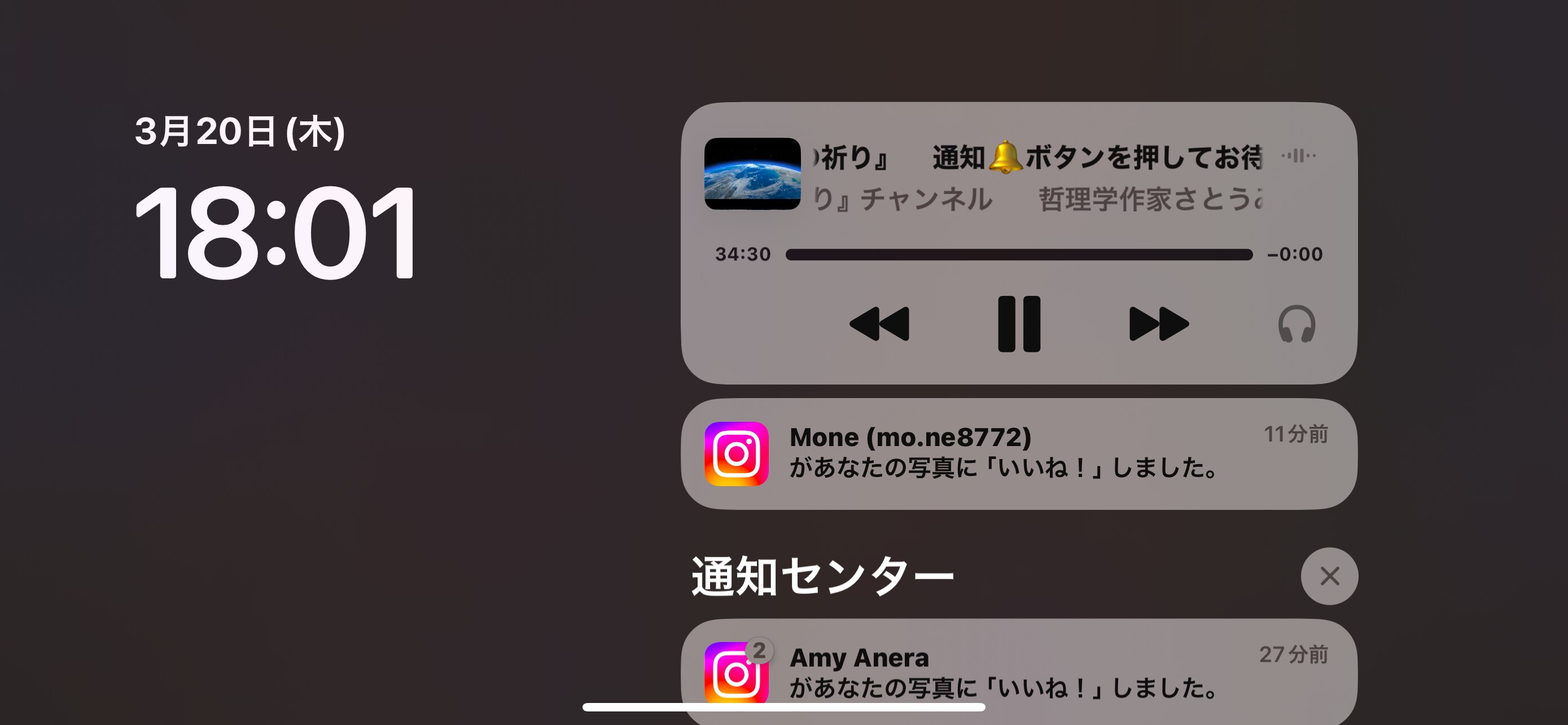 とさとうみつろうさんの純正律カノンを聴きながら、春分点となったと感じたら時計を見ようと想い、その感じた瞬間にスマホを開くとジャスト!【18:01】思わずスクショ^^