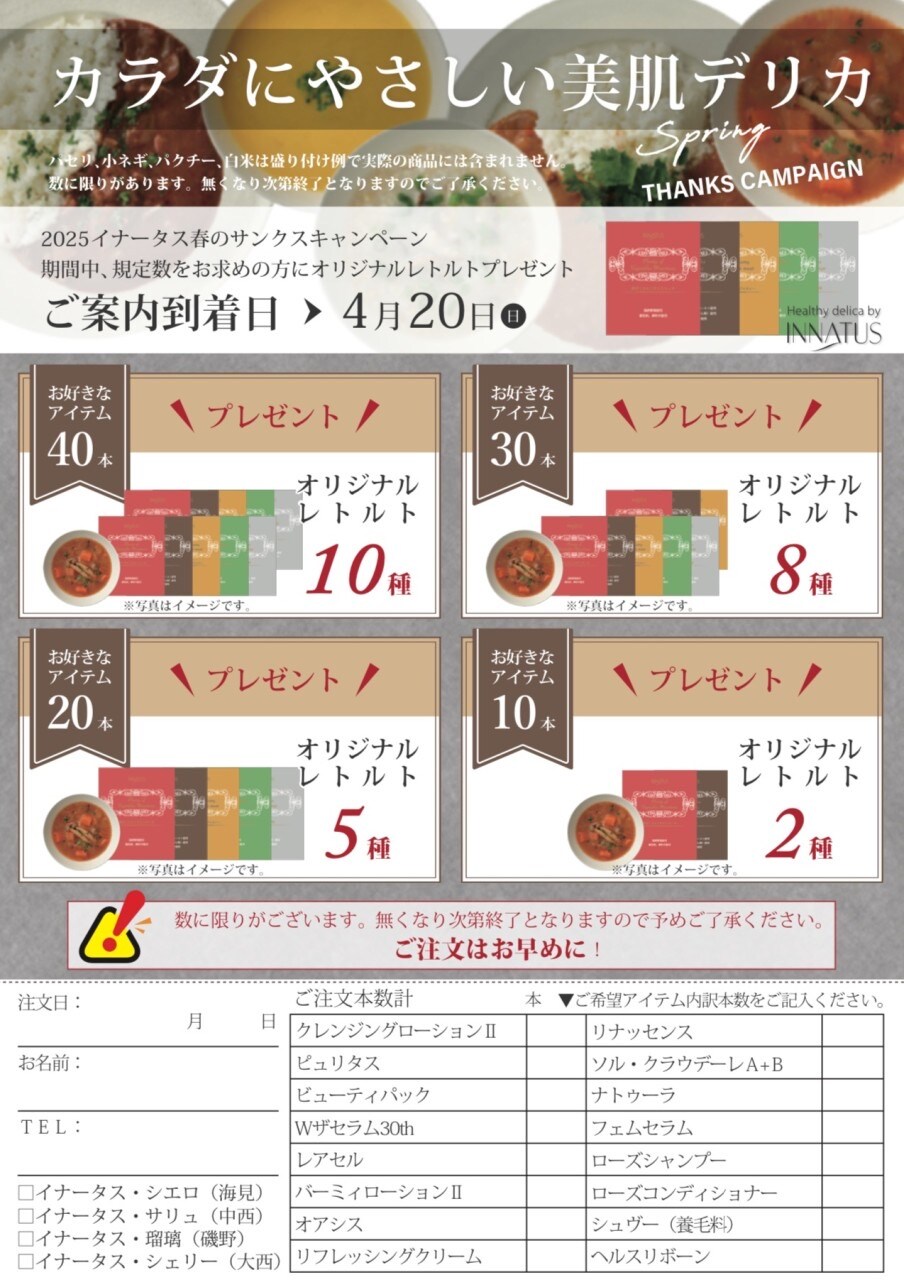 3月20日よりスタートした「春のサンクスキャンペーン」では、イナータス商品をご購入いただいた方に、購入数に応じてオリジナル美肌デリカをプレゼントいたします。