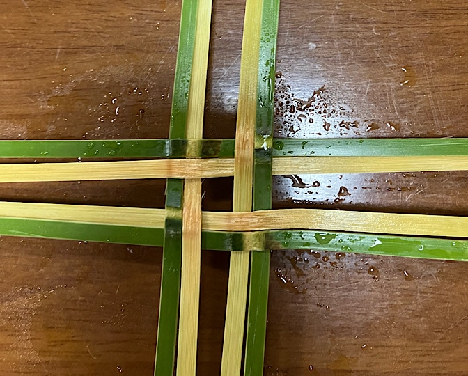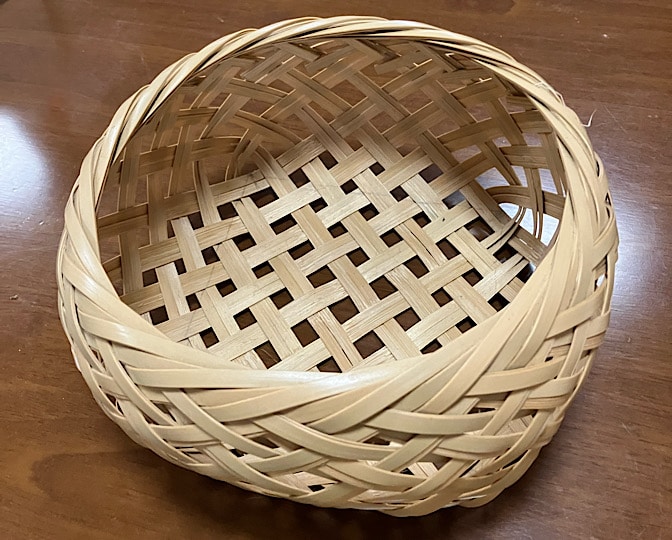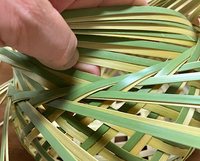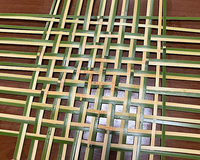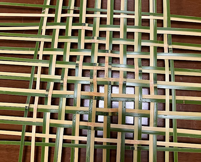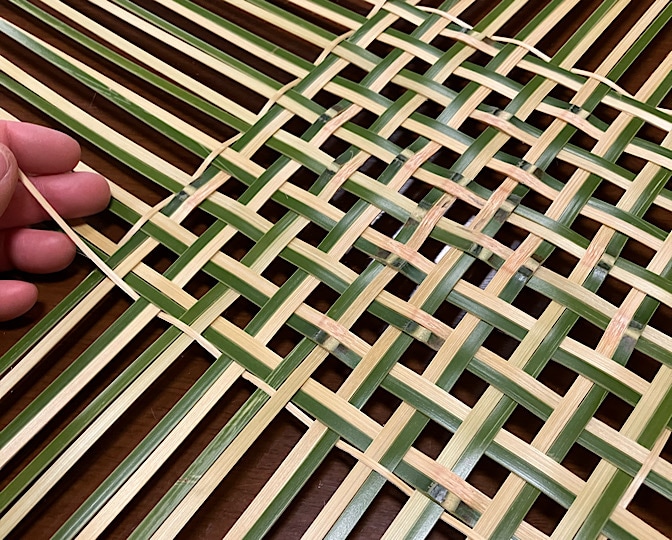 右に行くヒゴを、隙間に入れ込んで行くんですが、3目先だったか2目先だったか忘れましたが、斜めに入るように、順々に入れ込んでいきます。