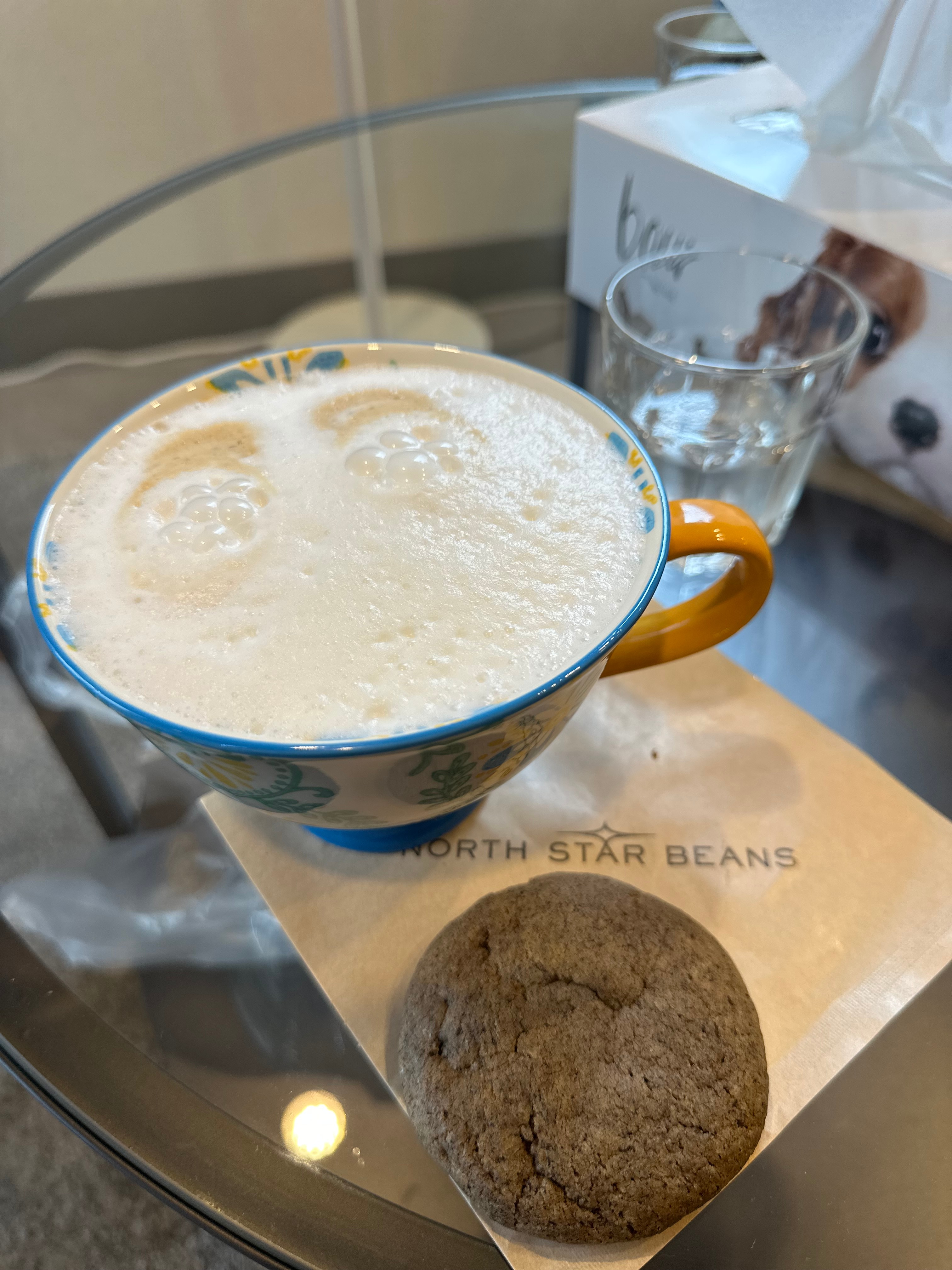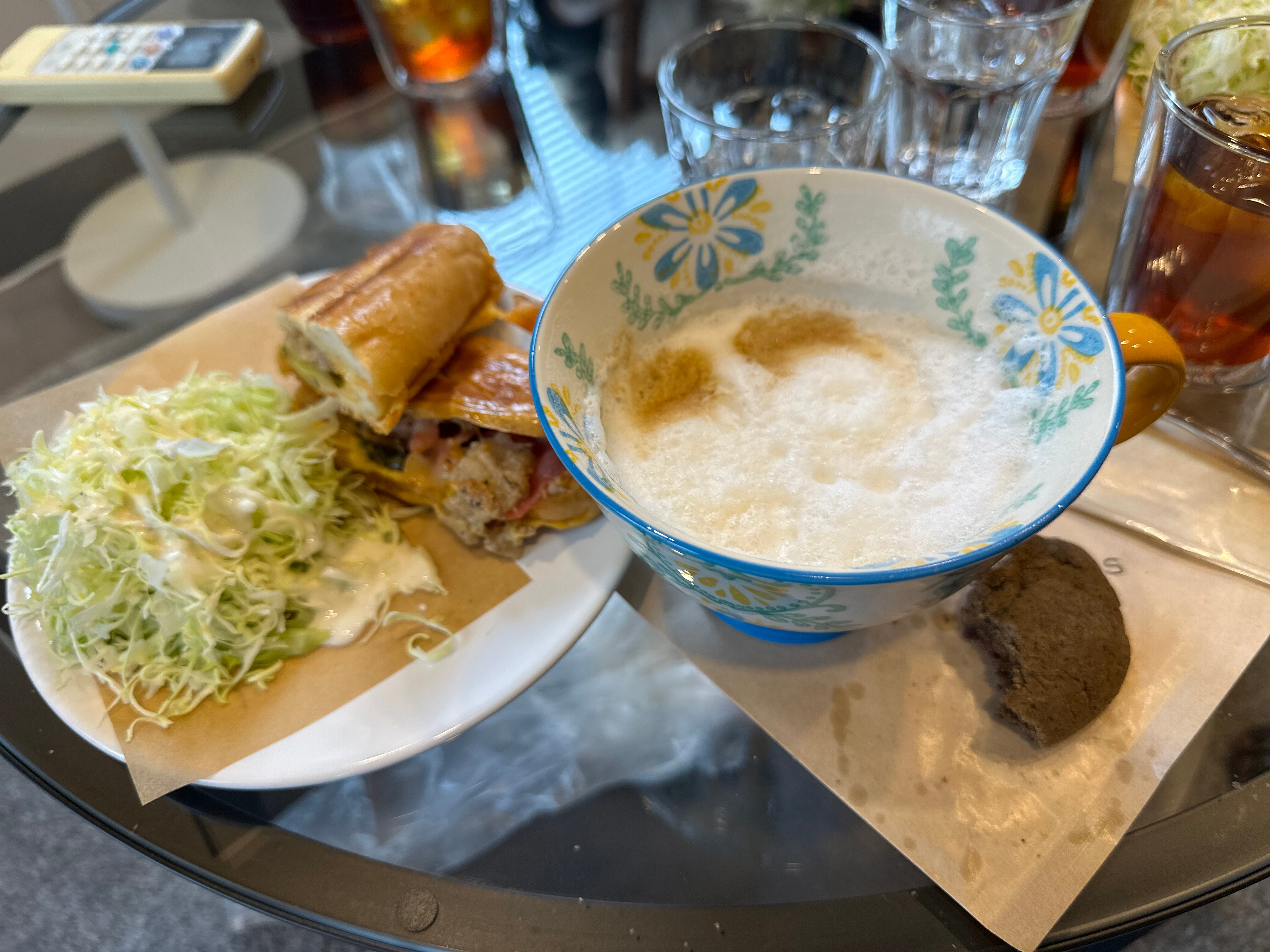 となるとセットで飲み物が欲しくなる。カプチーノをと思ったけど、メニューには無かった。エスプレッソにミルクという感じで作ってもらいました。