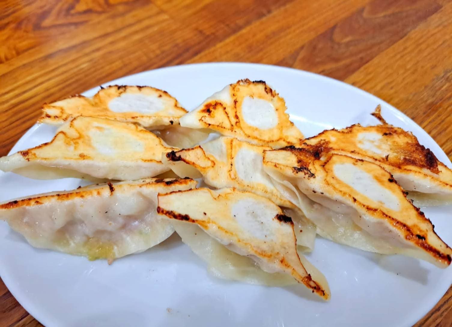 ニンニクが効いた手作り餃子で外はパリッと中はジューシーで美味しいです✨
