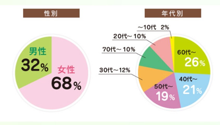 下記は公式サイトに公表しているデータ。性別と年代別ですが、13年前のものなので古いです。