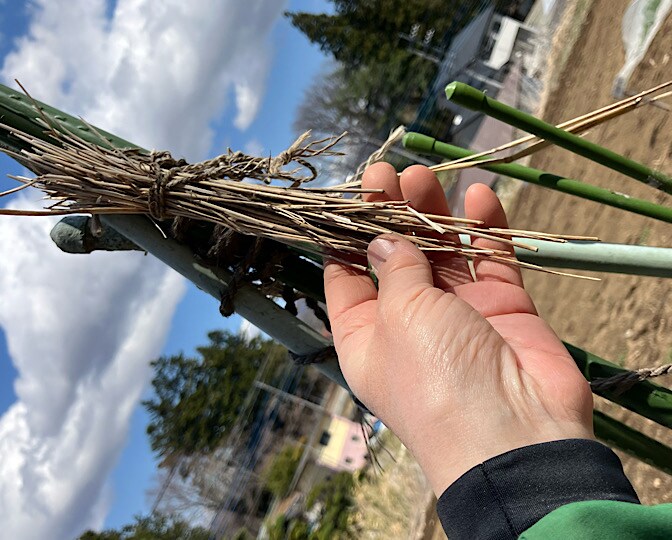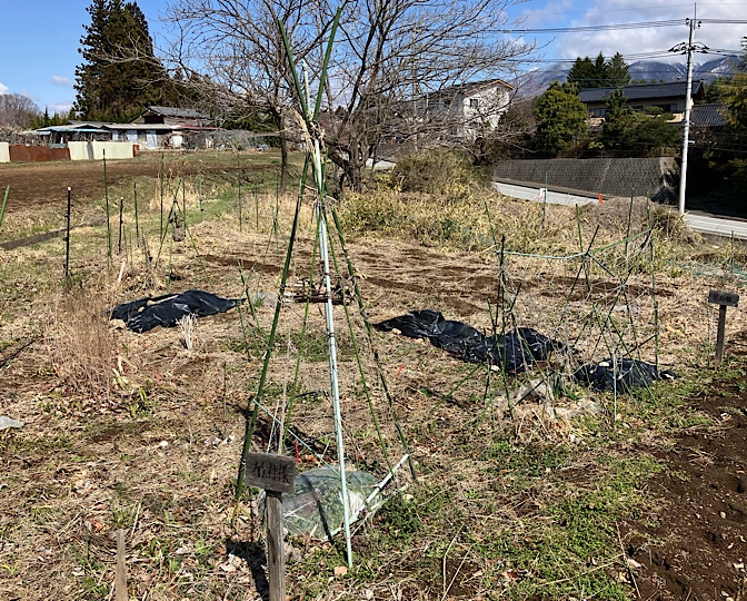 ヘチマを育ててたティピ型支柱の下のビニールを取りました。