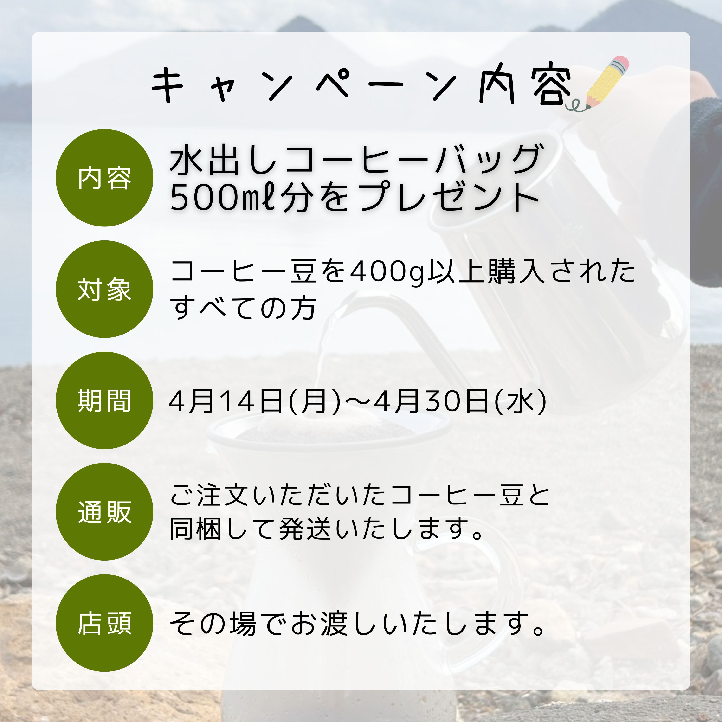 期間中、コーヒー豆を合計400g以上お買い上げいただいたお客様全員に、**500ml分の「水出しコーヒーパック」**を1つプレゼントいたします!