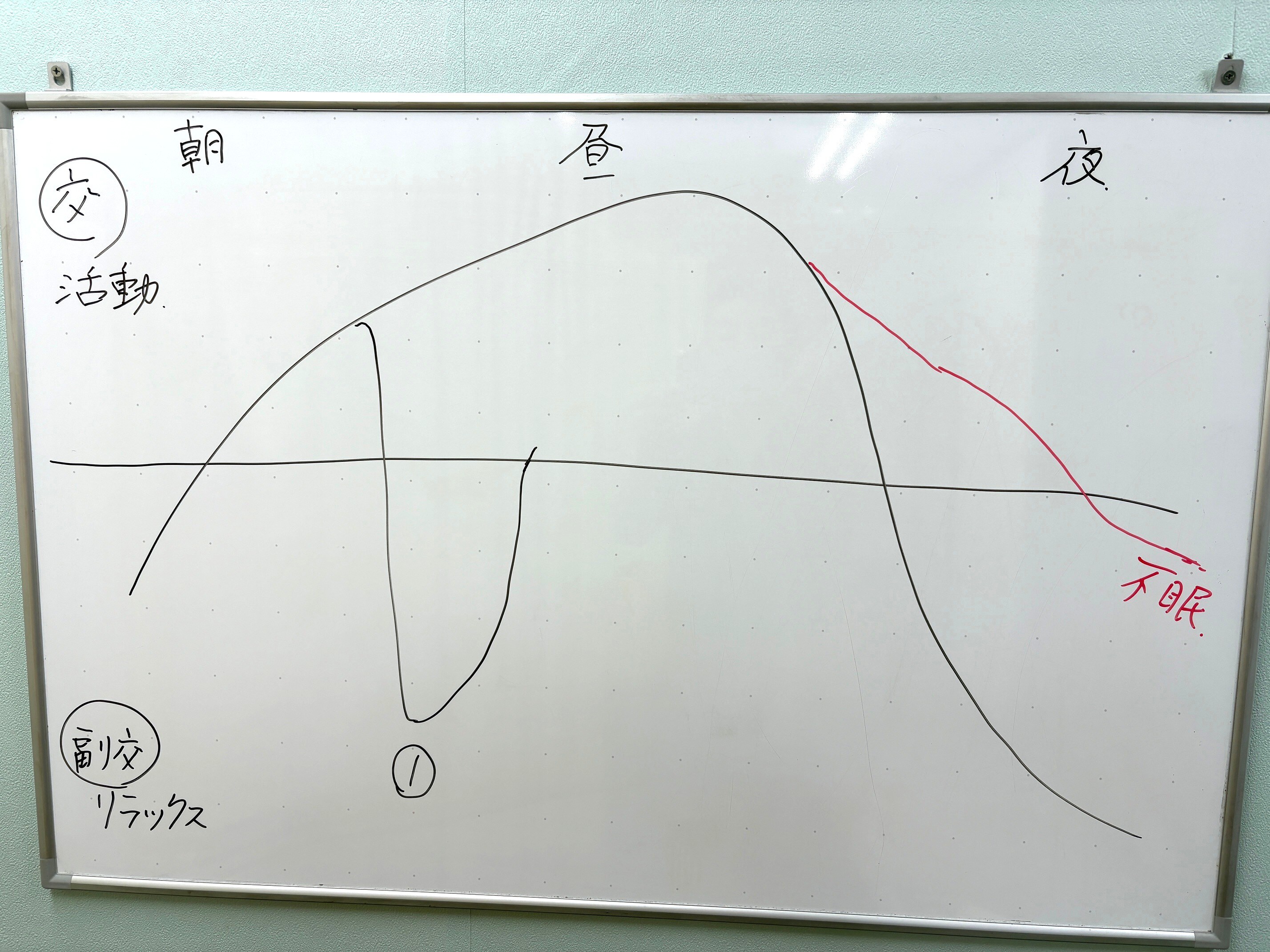 こちらは当院がホワイトボードで自律神経のご説明した後のものです。「副交感神経、交感神経、聞いたことはあるけどよく分からない」という方向けとお詳しい方向けの内容は変えています。
