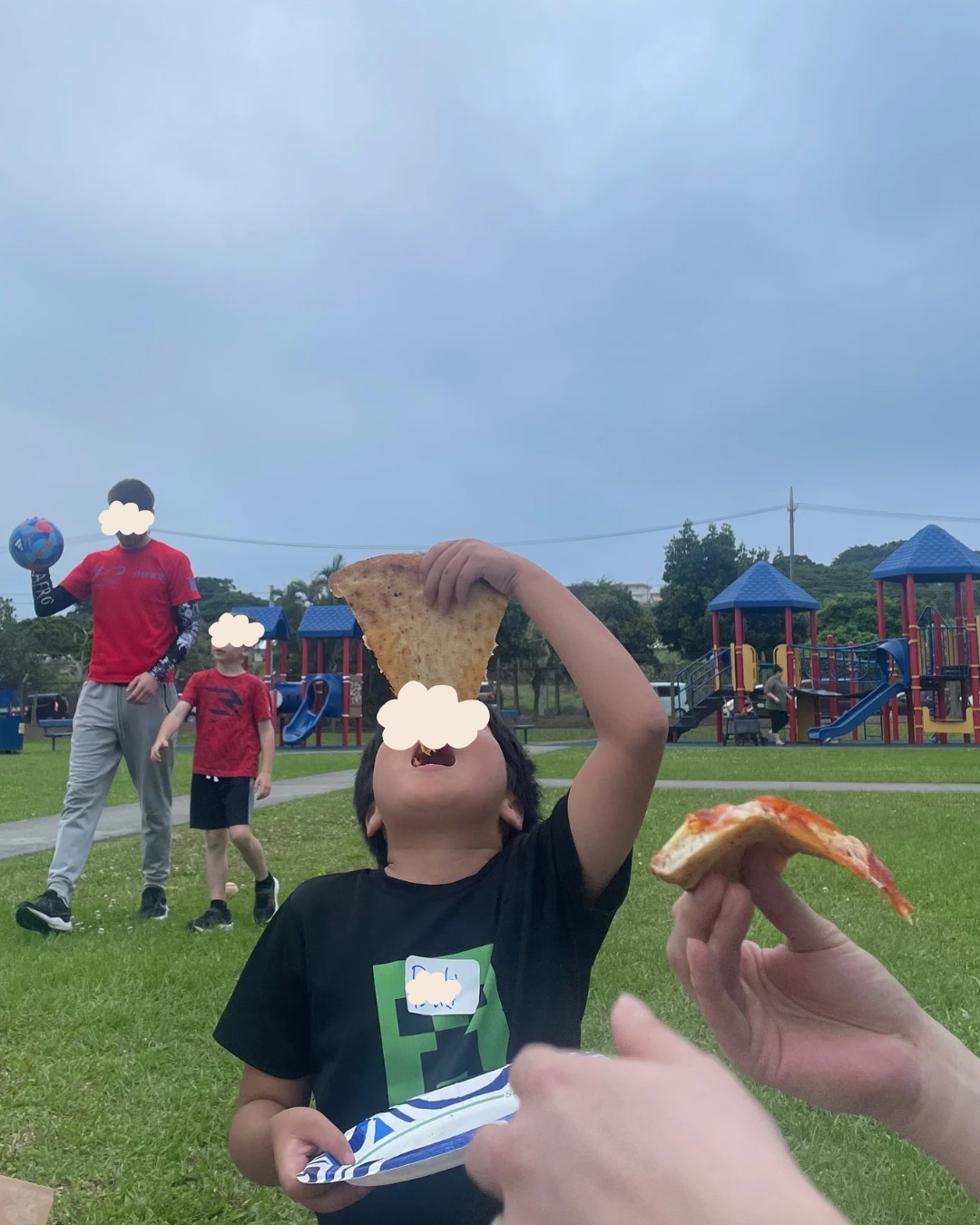ベース内のお店でピザを注文して🍕みんなで食べていると、1人の子が「これがアメリカの味か〜🧐」と感動していました✨