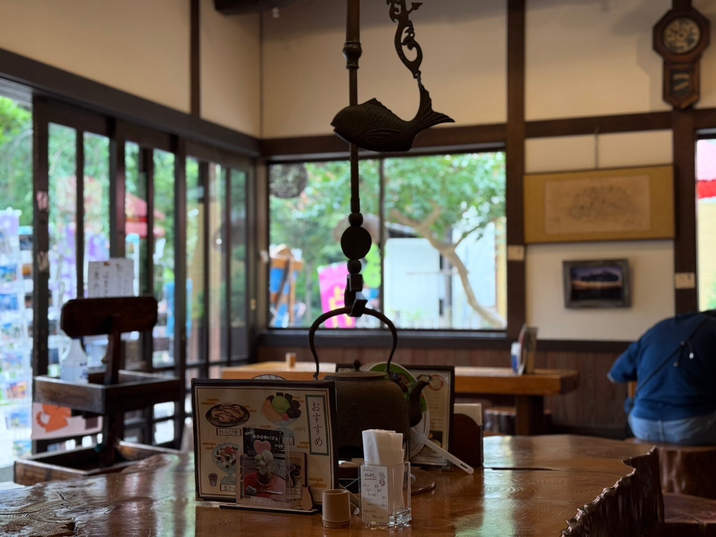 森の散策で少し疲れた頃、趣のある甘味処「あぶらや」さんで一休み。古民家のような店内で、窓から見える緑を眺めながら、白玉あんみつとメロンクリームソーダでほっと一息。