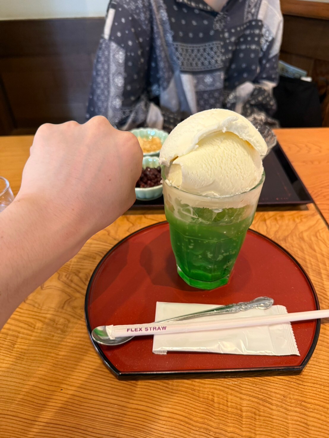 ぷるぷるの白玉と甘さ控えめのあんこ、鮮やかなメロンクリームソーダは、歩き疲れた体にじんわりと染みわたり、まさに至福の甘味でした。