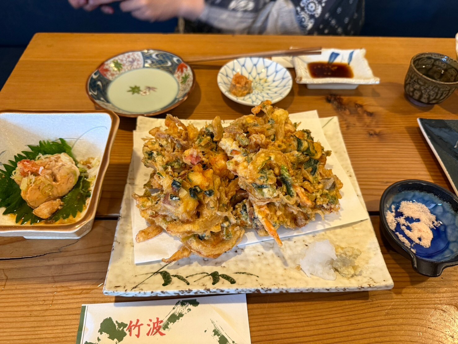 自然の恵みをたっぷり感じた後は、海鮮居酒屋「竹波」さんで美味しい海の幸を堪能!特に、新鮮でとろけるようなお刺身と、香ばしくてサクサクの海鮮かき揚げは絶品でした。