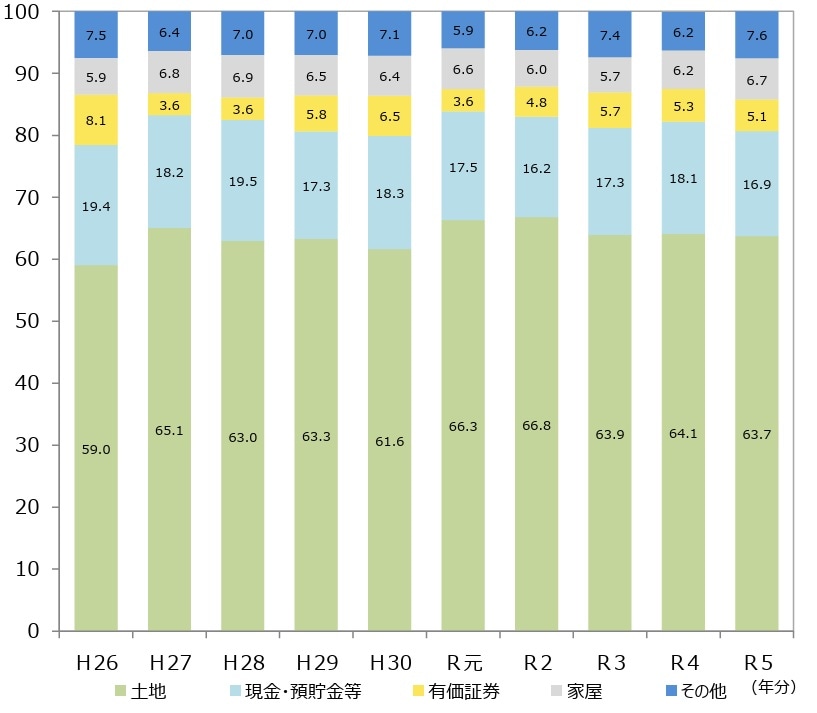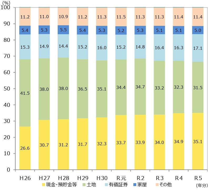 令和5年のデータになりますが、相続財産の金額の構成比率の推移を現したグラフがあります。