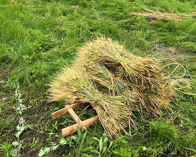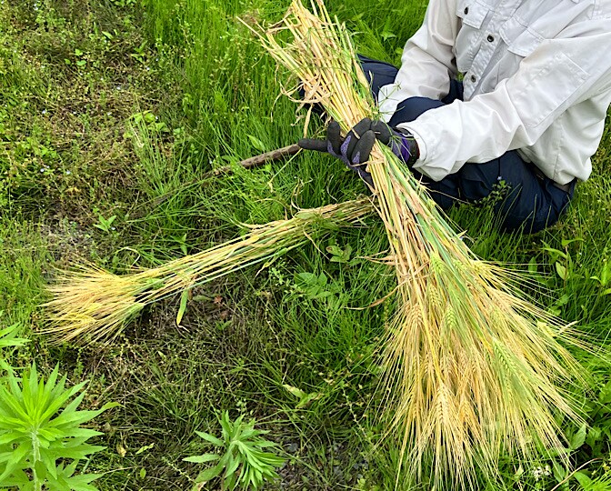 大麦は、親指と人差し指の輪っかで掴めるくらいの束にして、それを2束、交差させて置いていき、刈り終わってから一気に括っていきます。