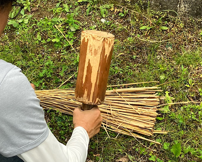 稲藁のハカマを取って、根本の方を水につけてから木槌で叩いて柔らかくします。