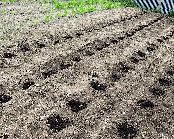 大豆は、大麦の跡地で育てますが、スギナがすごいので、甲州モロコシの手前を耕して種を蒔き、苗を育てておいて、後日、移植します。