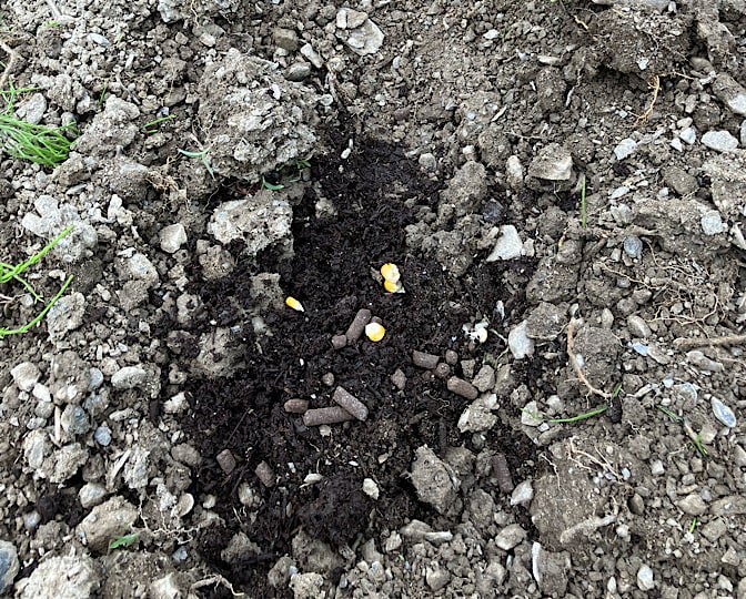 発酵牛糞を両手でポン! その上に鶏糞を3本の指でひと掴み、そこに甲州モロコシの種を4粒まきました。