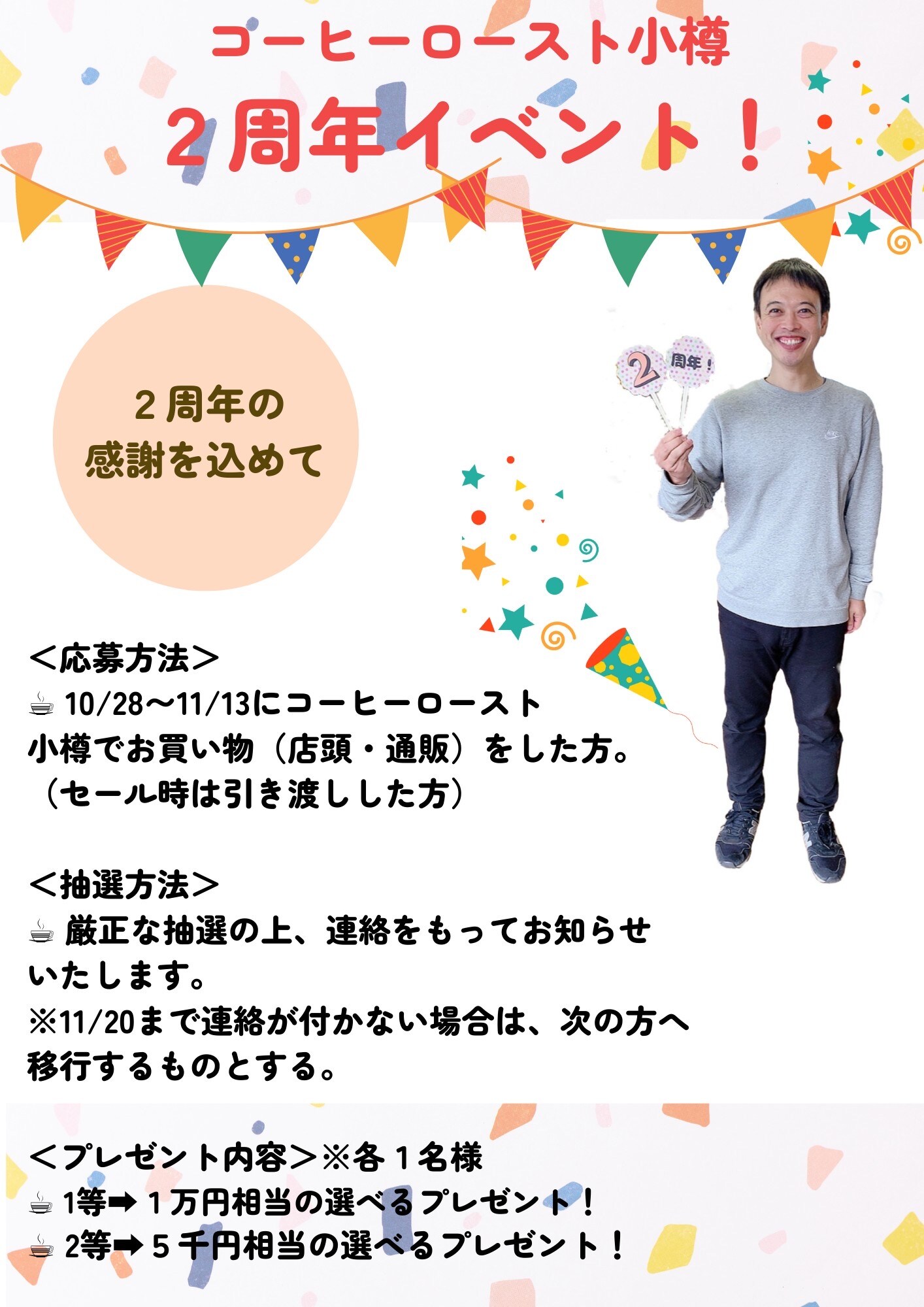 本日11月13日(日)をもちまして、コーヒーロースト小樽は2周年を迎えることができました。