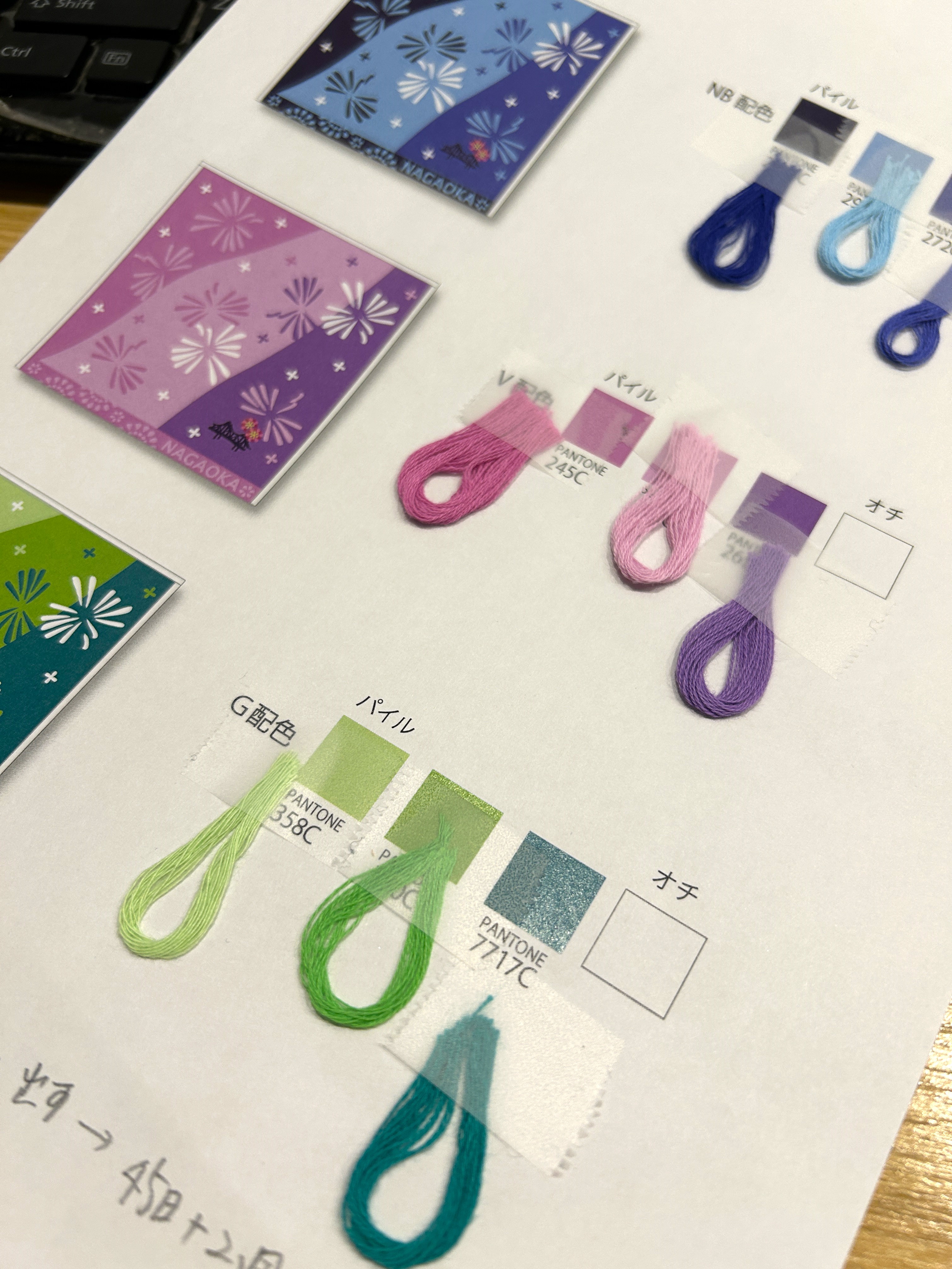 配色を検討するとき現物の試作が出来ず、糸を数本ビーカーで染めたものを見て色を決定しなければなりません(;^ω^)