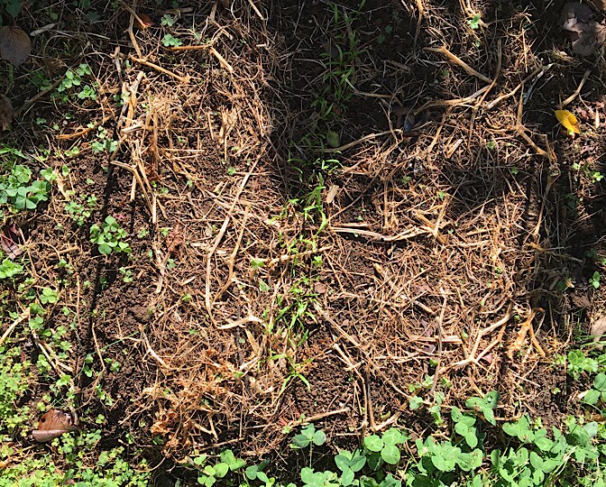 カル酢を作った時に出た卵の殻も、草マルチの下に撒いときました。