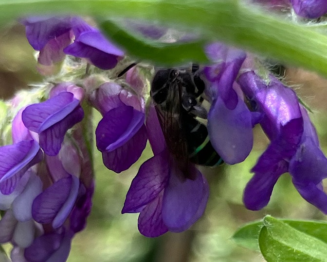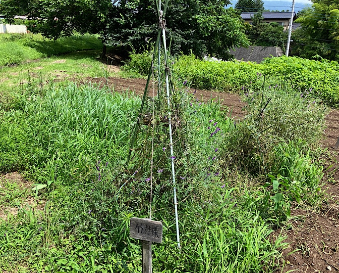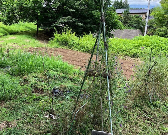 ティピ型支柱にヘアリーベッチが、やっぱり鉄条網のように絡みついてるーー!!