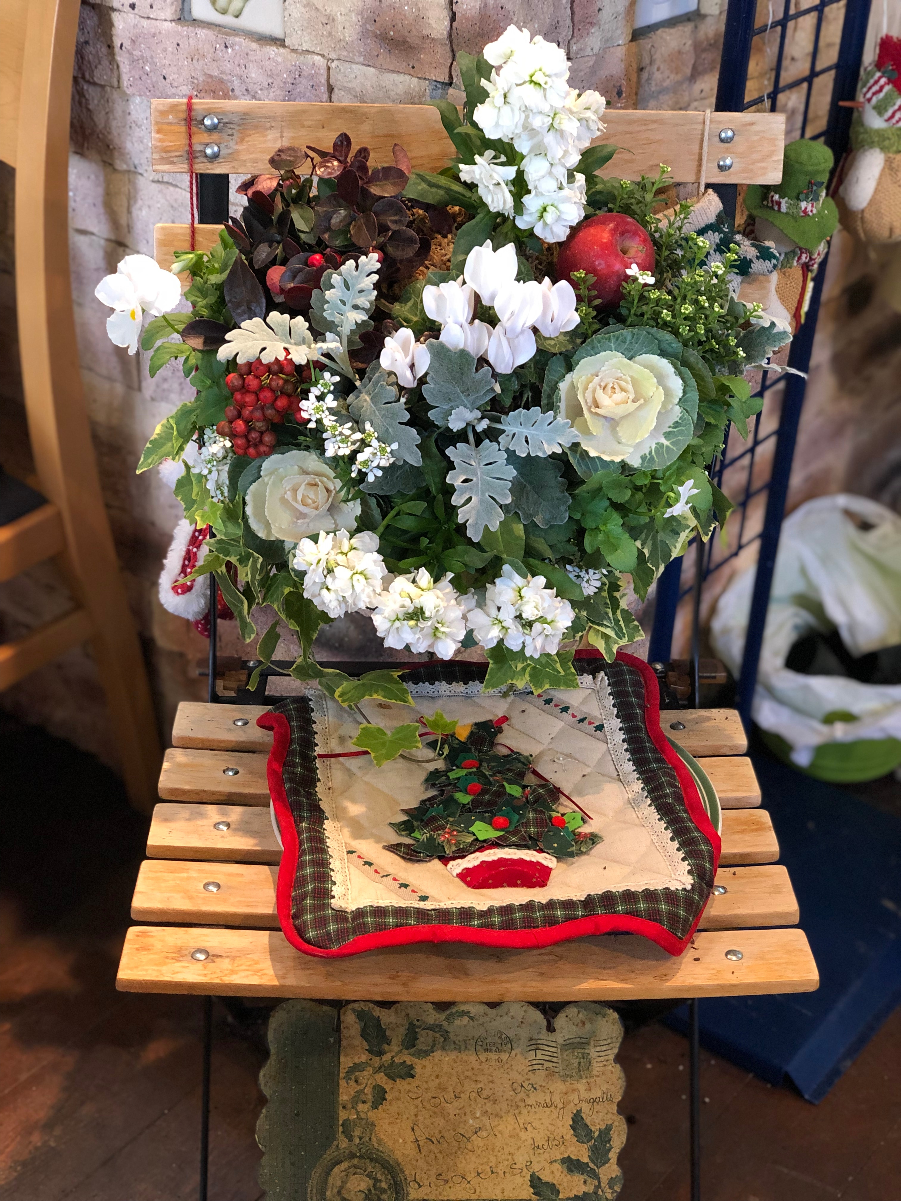 花や葉物の中にミニリンゴやクリスマスオーナメントを飾ったりと、