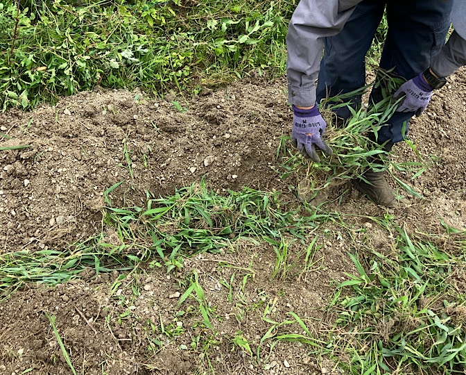 今回は、溝に草を入れて、そこに土を被せていきます。