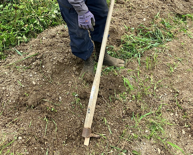 溝に両足を置き(草を踏みつける!)1、2、3…と、近くから遠くへ、鍬を使って土を乗せていきます。