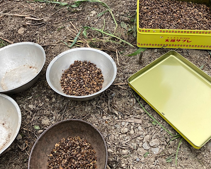 しごと塾やってて、西原に移住しちゃって、師匠の下でみっちり教わって、今ではしごと塾の教え役になってる人(あーー! 回りくどい!!!^^;)のお家で出た木灰を一握り撒いて、その上に種を軽く一握り、蒔きまーす!!