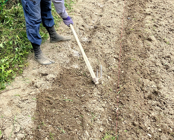 蒔き溝を作るときは、溝の上に両足を置き、鍬で土をサクッと掬って手前に盛る…てのを繰り返していきます。