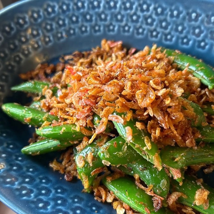 ③ボールにスナップえんどうとアミエビを入れ、よく絡める。花椒を少々。だしを少々。