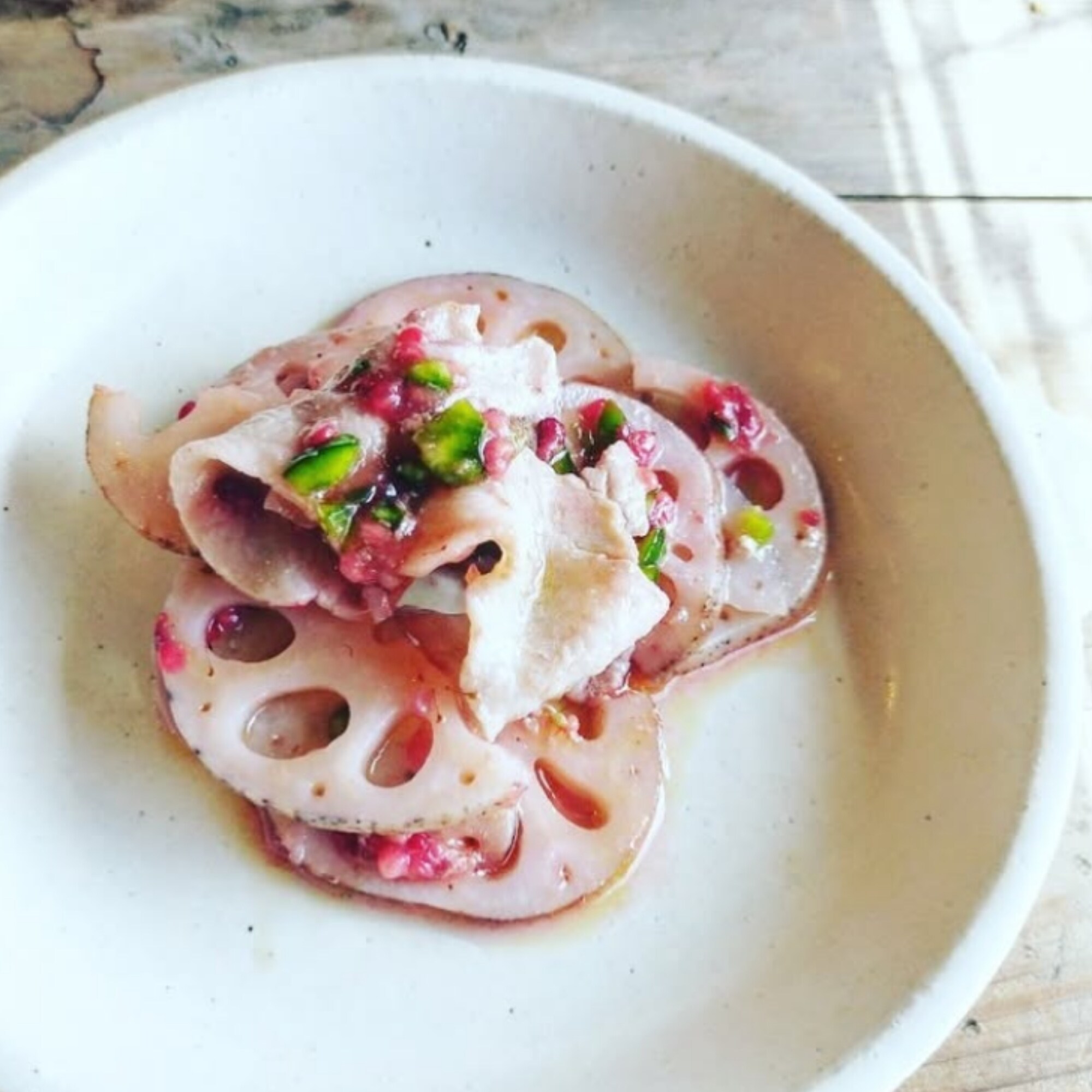 れんこんを薄切りにして湯がきラズベリーと葡萄の果汁を和えるだけの簡単レシピ。