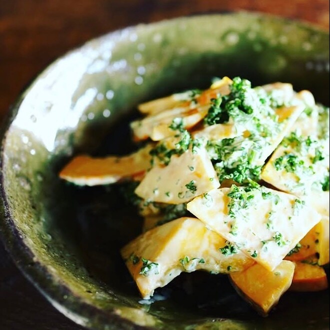②ボールにみじん切りしたパセリとたべる基本のだしと白胡椒を混ぜて、切ったコリンキーを入れよく混ぜ合わせる。