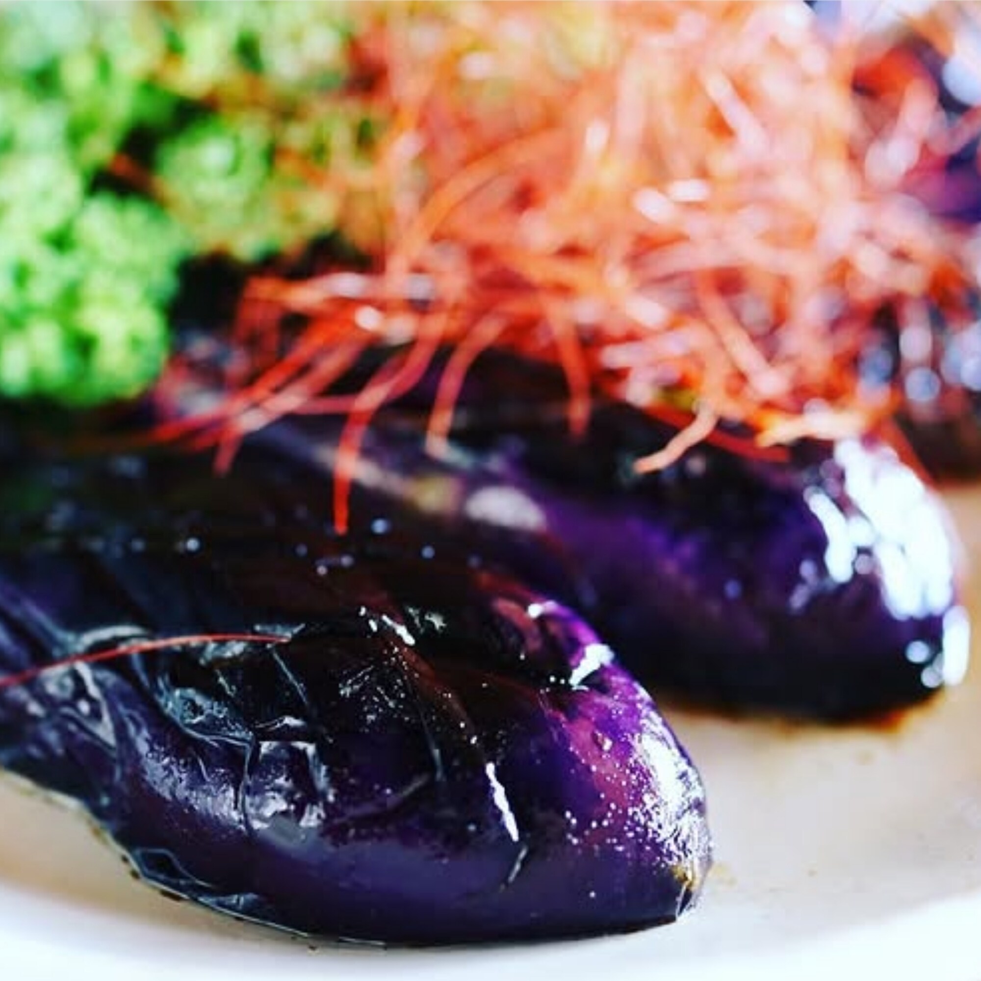 ①油を敷いたフライパンで半分に切った茄子をじっくり焼く。