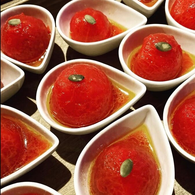 ②レモン果汁とたべる基本のだしとオリーブ油をよく混ぜ、湯むきしたトマトを漬け込み冷蔵庫で冷やす。