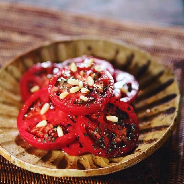 輪切りにしたトマトをオリーブ油とだしとレモン果汁を入れ混ぜたバットに入れ味が馴染むように絡める。盛り付けるときに松の実をちらす。