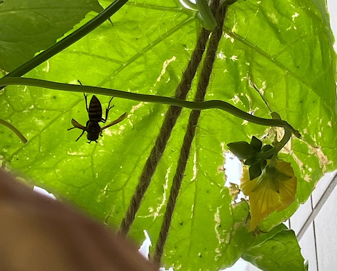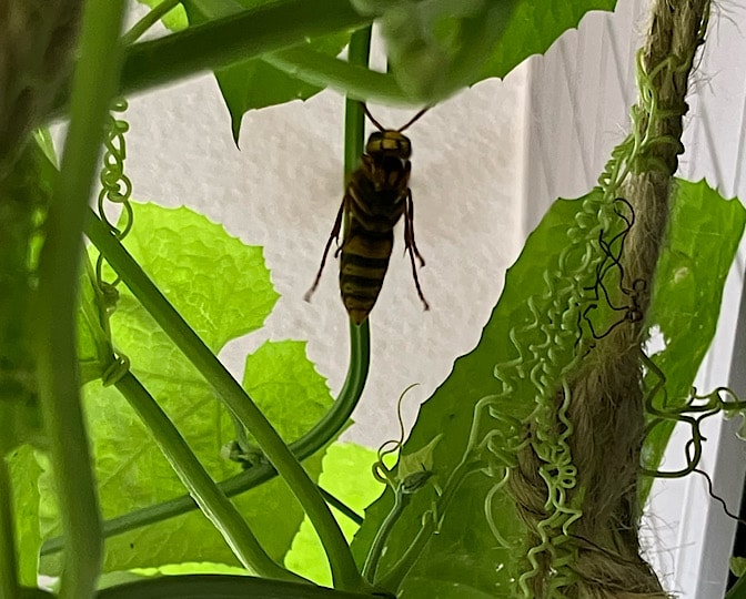 薄荷のオイルをヘチマの周囲に吹きかけたり、偽物のスズメバチの巣を吊るしたり、薄荷のオイルを綿に染み込ませて吊るしたり、オニヤンマ君を吊るしたり…と、色々やったんですが、ちゃーーんと毎日来てるのですよー!!