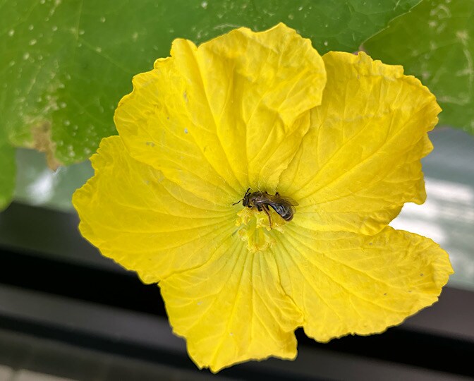 ヘチマの花もいっぱい咲いて、葉っぱを食べる小さな甲虫(かな?)や、ちびっこ花蜂や花アブも来たりで、賑やかになってました。