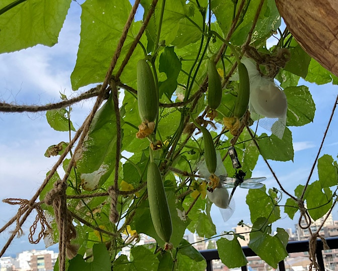 ヘチマは人工授粉して、8本くらいぶら下がってます。
