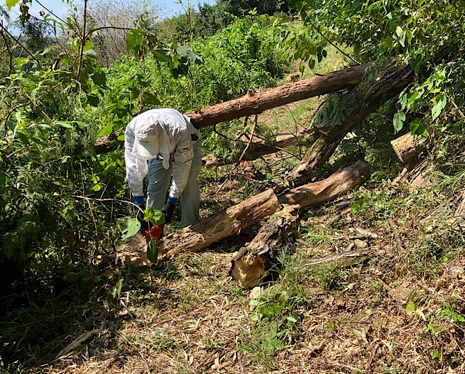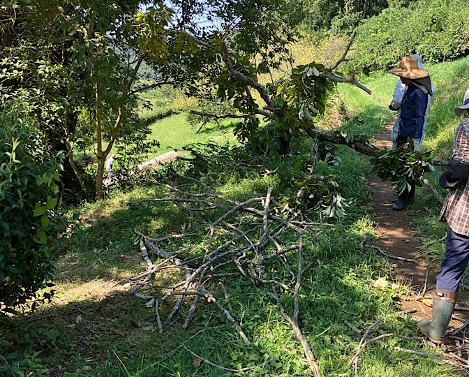 畑に設置のベンチに荷物を下ろし、まずは、畑を見下ろす道に落ちてる枝の処理から。