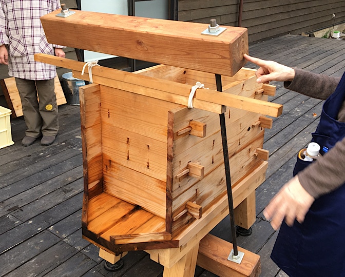 お醤油絞りの道具(フネ)は、去年、地元の大工さんに作ってもらっていました。(いくつかのグループの共同購入です)