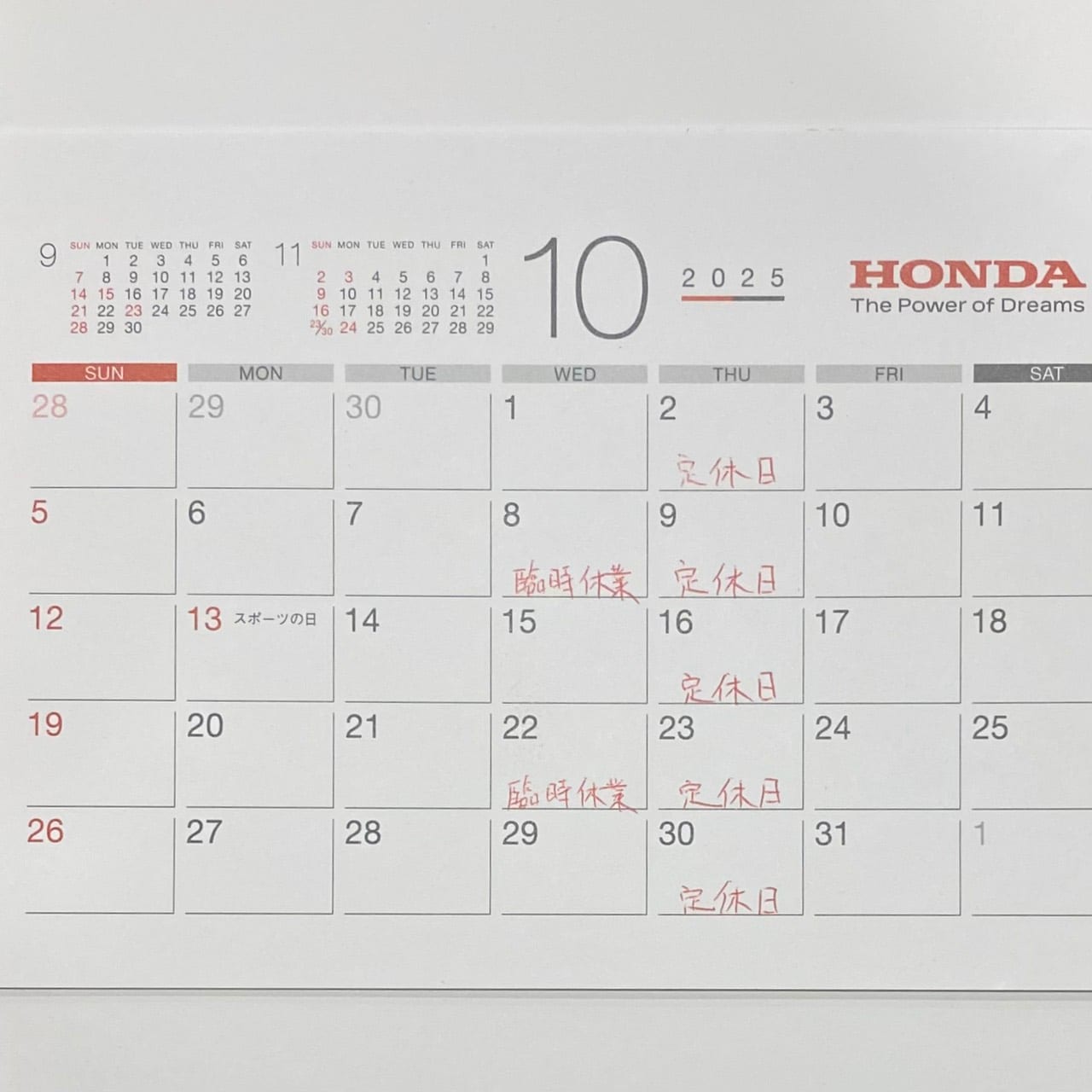 10月の定休日、臨時休業のお知らせ