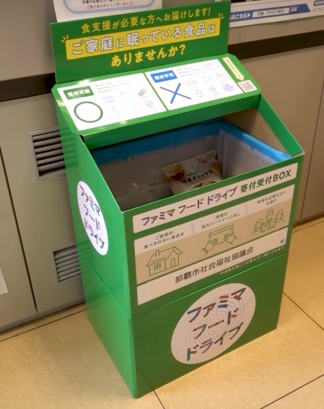 店内の一角に「ファミマフードドライブ寄付受付BOX」にお客様の中から子どもフードバンクKFBへ物資の寄付をおいていただいています😌🫶🏻