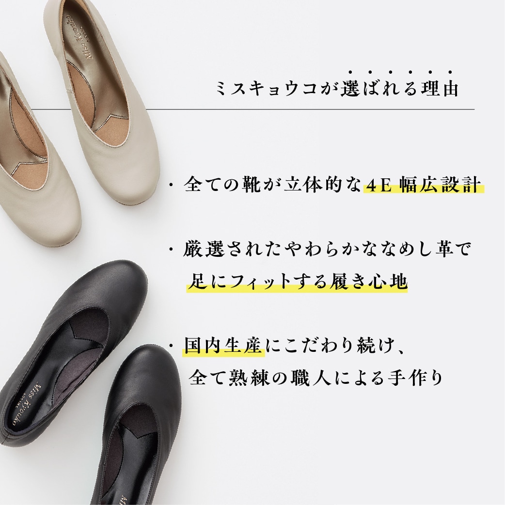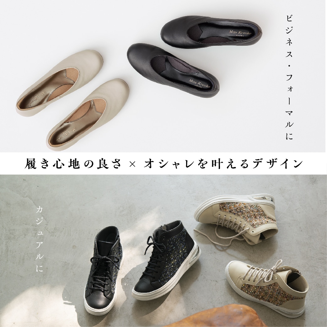 外反母趾など、足に悩みがある人でも、おしゃれ心を忘れないかわいいデザインで人気のミスキョウコの靴!