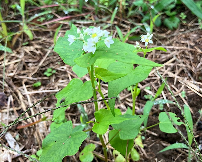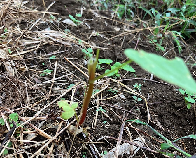 キキョウ無き跡には、鎌でゾリゾリ根切りして、ムギワラギクとクリムソンクローバーを蒔いておきました。